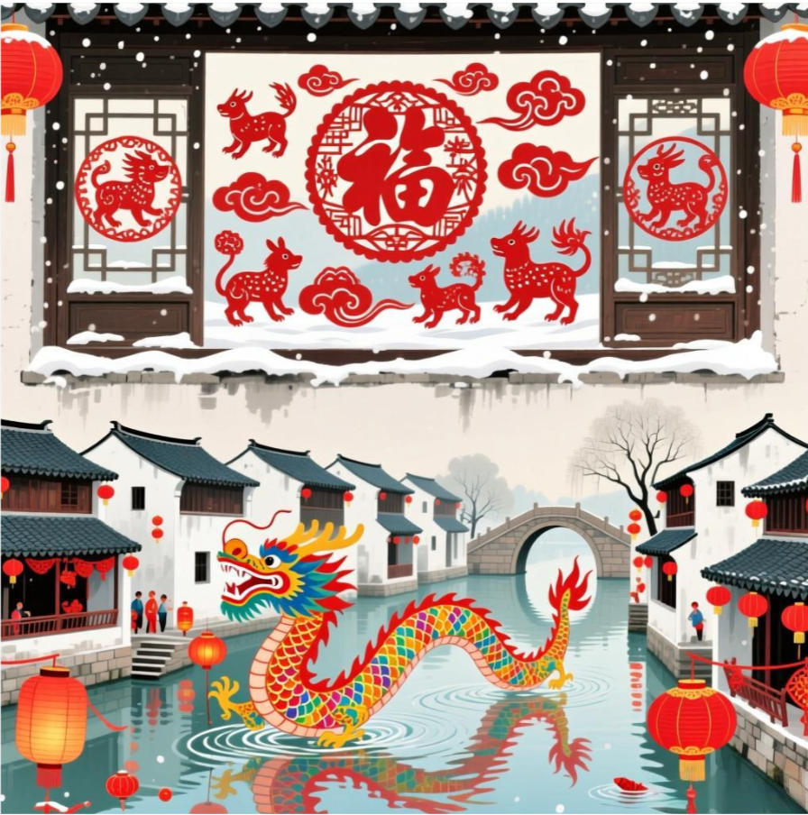 乡村画卷:北方农村的窗花剪纸与南方水乡的舞龙表演交织,传统年俗在新时代焕发新生。