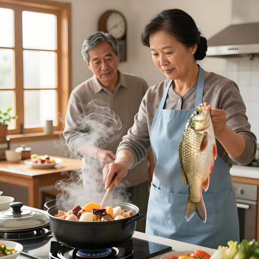 家乡味道:厨房里飘出的丰盛菜品香气,父母正在给孩子烹饪的"年年有余"菜品佳肴。