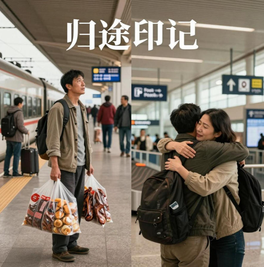 归途印记:火车站里提着工作地特产的游子,机场大厅亲人相聚的拥抱瞬间。