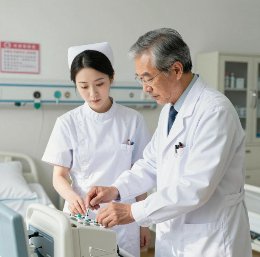 岗位传承:元旦期间,老医生带年轻护士查房的身影,师傅手把手教徒弟操作设备。
