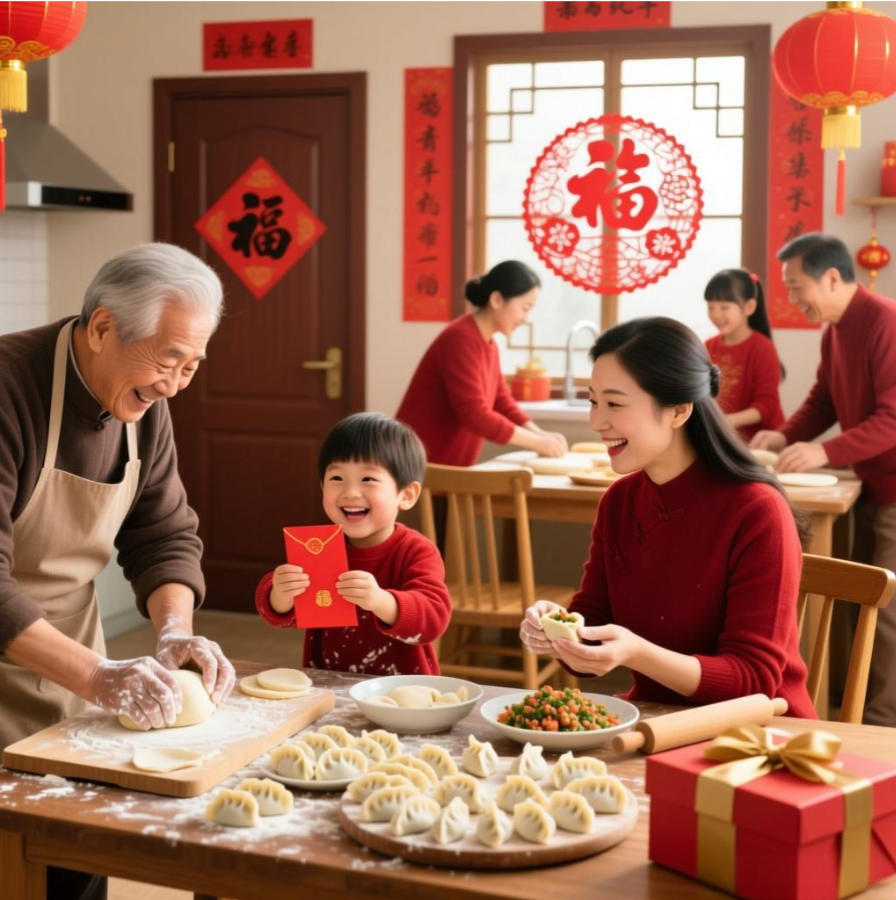 家庭温馨:三代同堂包饺子的温馨场景,孩子们兴奋地拆开新年红包的喜悦。