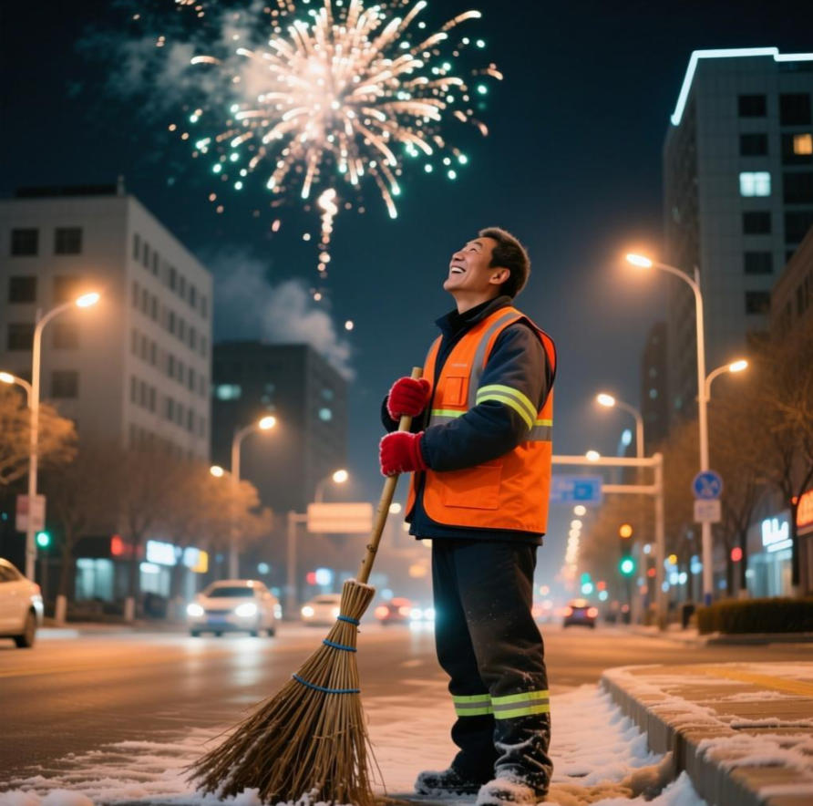 城市美容师:凌晨街道上清扫烟花的环卫工人,冻红的双手紧握扫帚看着漫天的烟花,露出期待与家人团聚的幸福笑容。